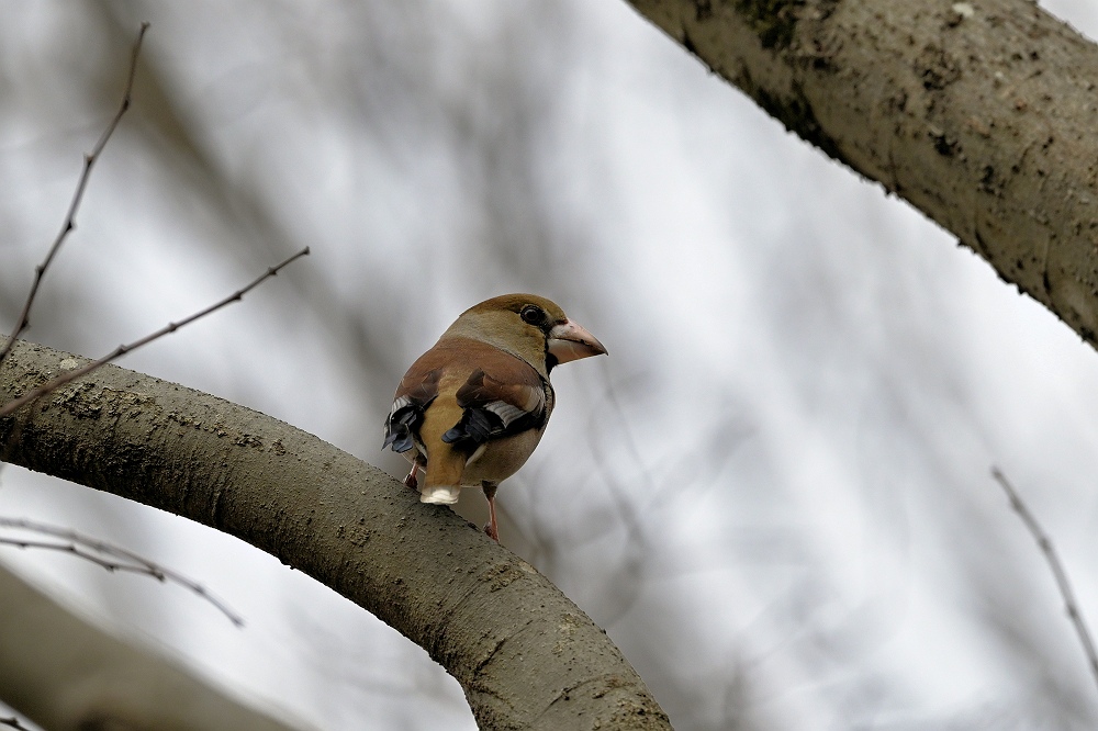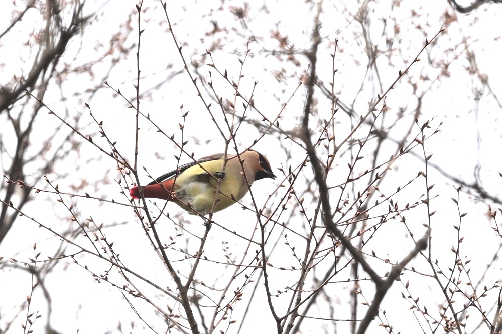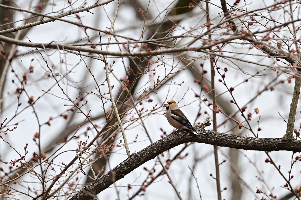 | ぐずついた日が続いています。那須はまだソメイヨシノがつぼみのままで平地ほど華やいだ雰囲気はありません。標高が300mほどの那珂川下流の鳥野目河川公園まで降りてくるとミツマタやサンシュユ、レンギョウなどが咲き、サクラの花芽も膨らんでいました。渡りの鳥たちも餌探しに余念がなく10羽以上のシメの群れが地面に降りて採餌。ツグミやヒヨドリは一部渡りを開始しているのか数が少なくなってきているように思えます。 |