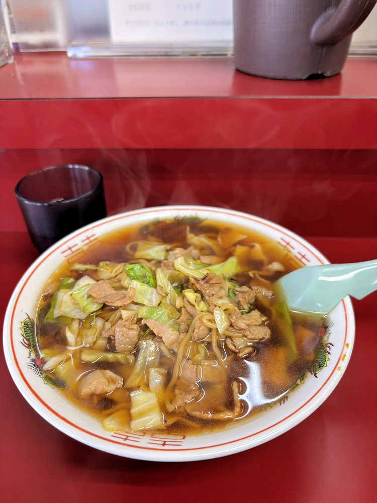 | 「こばや食堂」のスープ入り焼きそば 「釜彦」も有名 味は焼きそば、見た目はラーメン 癖になります |
